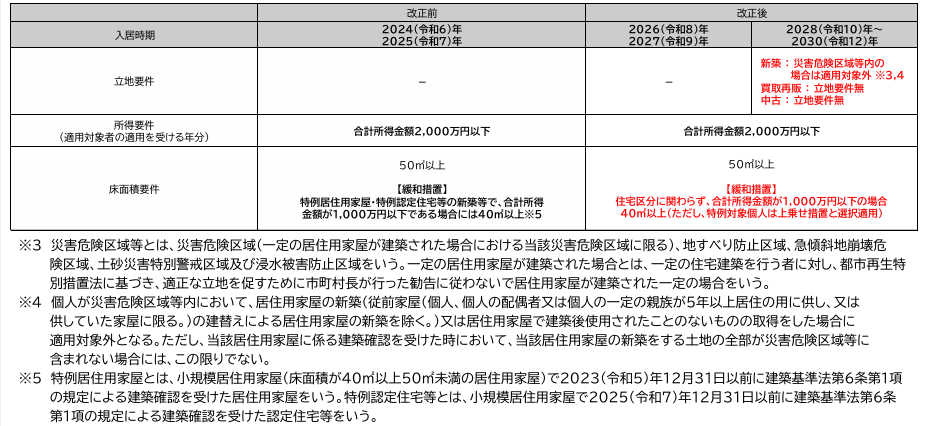 ⑤ 令和10年以降に入居する場合、土砂災害等の災害レッドゾーン※の新築住宅は適用対象外とする(建替え・既存住宅・リフォームは適用対象)