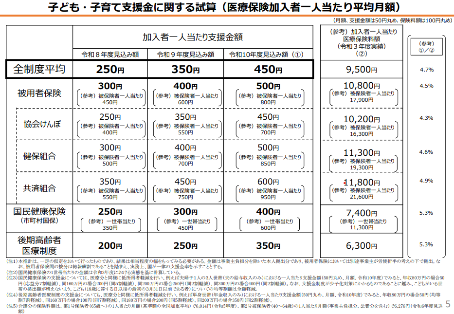 加入する医療保険、世帯、所得の状況等によって異なるが、全加入者1人当たりの平均見込月額は、令和8年度250円、9年度350円、10年度450円程度と推計されています。